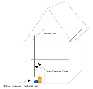 autonome, un diamètre de deux pouces sera alors suffisant pour y insérer le câblage électrique servant à brancher les panneaux solaires photovoltaïques présents sur le toit aux accumulateurs se trouvant au sous-sol. Pour un système PV en production distribuée, c’est-à-dire connecté sur le réseau de distribution d’électricité, les panneaux seront reliés à un onduleur couplé au réseau.
