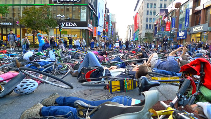 Note : l'expression "libérez les piétons enfermés dans les voitures" est empruntée au collectif « rouler à vélo » qui organisait ce même soir l’événement « en vie sans ma voiture ». Opération presque théâtrale symbolisant la plus grave conséquence de la culture automobile : la mort.