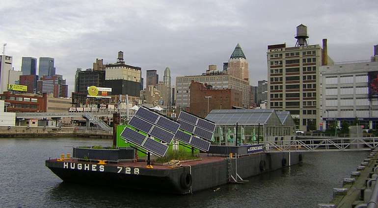 Des initiatives pour cultiver sa propre nourriture en ville existent aussi à New York. Le projet Science Barge est pour le moins étonnant : des serres ont été installées sur une embarcation alimentée par l'énergie solaire, éolienne et par des biocarburants. Les serres sont irriguées avec l’eau de pluie et l’eau de la rivière purifiée. Ces serres permettent la production d'aliments en ville sans générer un seul gramme de gaz à effet de serre. Selon New York Sun Works, l’organisme initiateur du projet, les légumes qui poussent dans la Science Barge nécessitent sept fois moins d’espace et quatre fois moins d’eau que s’ils avaient poussé en plein champ. Ce projet se veut éducatif et la prochaine étape visée par l'organisme est d’installer de tels systèmes de production d'aliments sur les toits de New York. Selon l’organisme, les toits de New York pourraient fournir assez d’espace pour produire suffisamment de légumes pour couvrir les besoins de tous les new-yorkais!