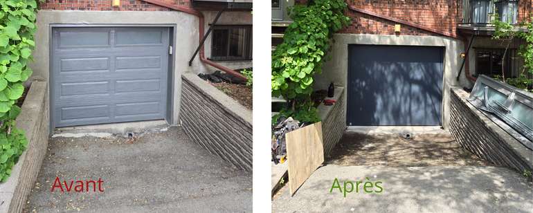Dans une entrée en contre-pente se trouve généralement un avaloir extérieur (ou puisard), au-devant de la porte connectée par un drain à la fosse de retenue du garage. Pour éviter un refoulement des égouts au-devant de la porte, le drain a été déconnecté de la fosse et connecté directement au réseau d’égout. Un clapet anti-retour a également été ajouté pour empêcher l’eau du réseau de remonter devant la porte.