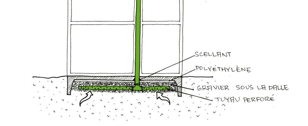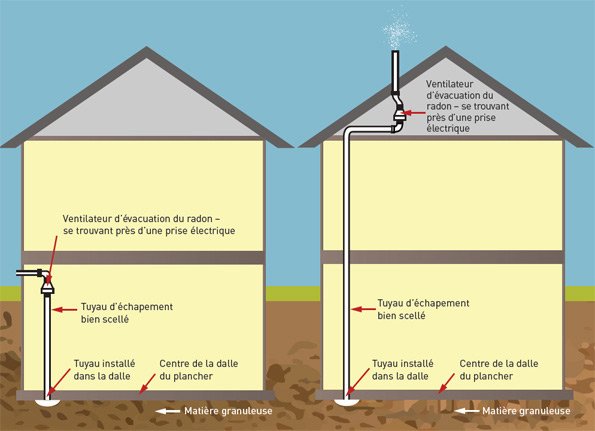 Il s’agit de poser une colonne d’évacuation de 4 pouces en plastique (du même type qu’une colonne de plomberie) qui commence sous la dalle, ou sous la membrane étanche parfaitement scellée, et qui rejoint l’extérieur de la maison. Le trou par lequel passe la colonne dans la dalle doit être parfaitement scellé pour éviter toute fuite. De cette façon, les gaz circulent sous la membrane ou la fondation et sont évacués par le tuyau d’évent par tirage naturel.