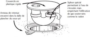 - Poser, sur l’avaloir de sol destiné à recueillir les eaux, un clapet spécial avec siphon. Il permet à l’eau de s’égoutter tout en empêchant le radon de s’infiltrer.