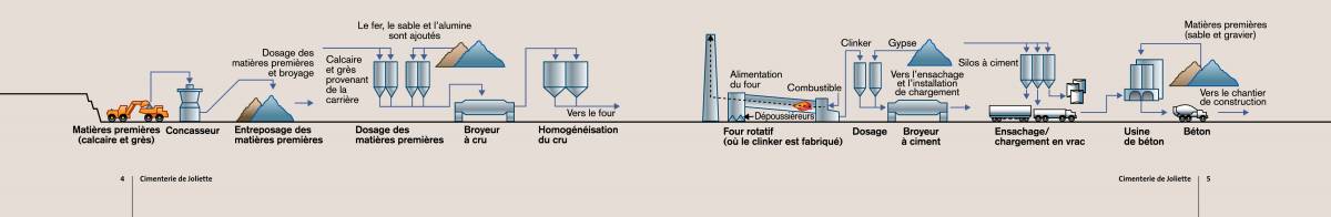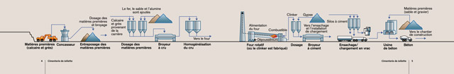 Le ciment est produit à partir de pierre calcaire broyée extraite des carrières (75 %) et d’argile (25 %). Ce mélange est appelé le cru. Le cru est cuit dans un four à très haute température, à environ 1450°C. Ce processus industriel consomme énormément d’énergie. En effet, 86% de l’énergie d’une cimenterie est utilisée pour faire chauffer le four (ABQ, 2006). Le combustible du four étant principalement composé de charbon (53 %) et de coke de pétrole (21 %), la quantité de CO2 rejeté dans l’atmosphère est considérable.