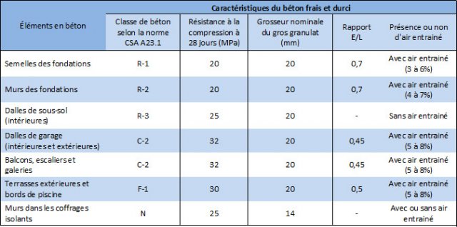 Le tableau suivant définit quelques autres caractéristiques de différents éléments à usage résidentiel, selon la norme CSA A23.1-14 et les pratiques courantes de l’industrie.