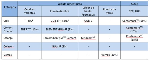 Pour ces raisons, il est très difficile d’obtenir des prix de bétons écologiques. Le tableau suivant recense divers ciments à ajouts cimentaires disponibles chez certaines cimenteries au Québec. Ce tableau est non exhaustif.