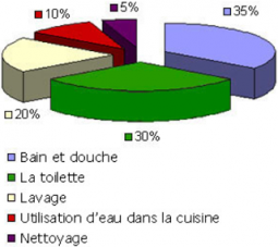 La consommation de l’eau dans une résidence. Sur cette figure, l’eau grise est constituée de toutes ces sources, mise à part la toilette. On note que l’eau issue du bain et des douches correspond à la demande totale en eau pour la chasse des toilettes !                            Environnement Canada