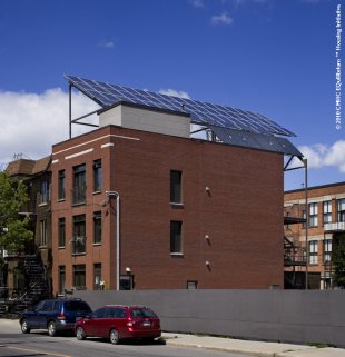 Une autre possibilité consiste à incorporer les panneaux à même le bâtiment, sur une façade par exemple. L’intégration des champs PV aux éléments d’un bâtiment (tuiles, auvent, vitrage) permet de rendre un immeuble producteur d’énergie en toute discrétion, bien que la majorité des propriétaires souhaitent que leurs exploits technologiques soient rendus visibles et publics.