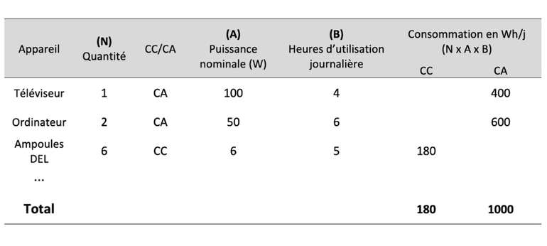Pour remplir ce tableau, vous devez vérifier l’information technique de vos appareils. Déterminez s’ils fonctionnent en courant continu ou alternatif, puis évaluez vos habitudes de consommation. Vous pourrez ainsi calculer l’énergie consommée pour mettre en marche vos appareils selon l’utilisation. Par exemple, une famille de quatre personnes nécessitera environ 40 kWh/jour, soit une puissance installée d’environ 12 kWc.