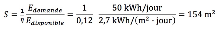 Une fois que vous connaissez votre besoin en énergie électrique, en puissance et en énergie, et que vous avez une bonne évaluation de la ressource disponible, vous êtes en mesure de calculer la surface de panneaux requise pour combler vos besoins. Par exemple, si vous avez besoin de 50 kWh/jour en moyenne, que la ressource disponible est de 2,7 kWh/m²·jour pour le mois de décembre (le pire mois de l’année) et que la technologie choisie a une efficacité de 12 %, alors la surface requise serait de :