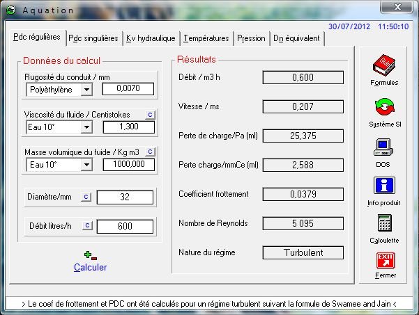 Vous pouvez tenter de dimensionner vous-même le circulateur (pompe) nécessaire. Pour cela nous vous conseillons d’utiliser le logiciel gratuit Aquation, très simple d’utilisation. Il donne les pertes de charge des tuyauteries par mètre linéaire.