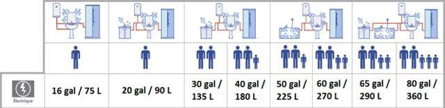 Mais le volume de la cuve ne doit pas être le seul critère à considérer lors du choix d'un chauffe-eau. La disponibilité de l'eau chaude dépend certes de la capacité du réservoir, mais aussi du taux de récupération du chauffe-eau, c'est à dire de la quantité d'eau chaude qu'il peut produire en une heure. Le tableau ci-dessous permet d'estimer le volume de stockage en fonction du nombre de points d'eau à alimenter et du nombre de personnes que compte le foyer :