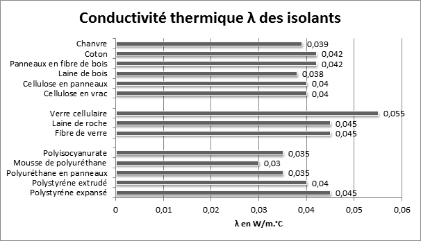 Le graphique suivant présente la conductivité thermique des isolants, appelée λ, c'est-à-dire la capacité qu’a un isolant à transporter la chaleur. Plus cette valeur est petite mieux c’est, pour obtenir la même performance d’un isolant à un autre ayant une conductivité différente il faudra jouer sur l’épaisseur à poser et par voie de conséquence sur le prix et l’encombrement. Attention, le graphique comprend un isolant qui n'existe pas encore au Québec, la laine de bois.