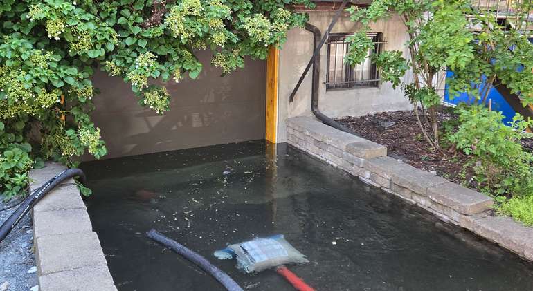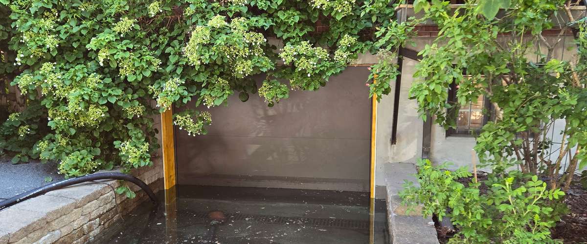 Après l’installation des portes étanches et des clapets antiretour : l’eau s’accumule devant la porte de garage sans pénétrer dans le bâtiment. Le clapet antiretour permet d’éviter le refoulement des égouts dans le garage.