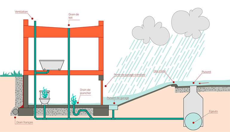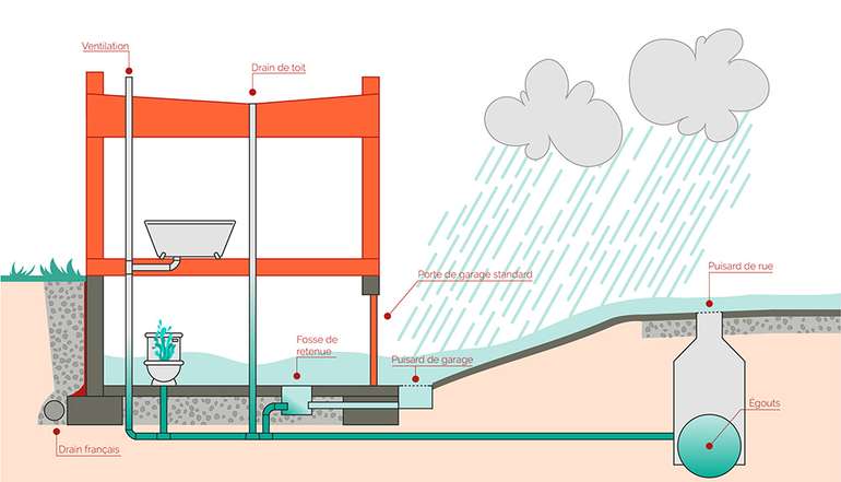 Avec l’installation d’une porte étanche dans une entrée en contre-pente, les travaux de modification de la plomberie doivent permettre de retenir l’eau temporairement devant la porte le temps que le réseau d’évacuation ne soit plus saturé. Cela consiste à dévier, de la fosse de retenue, le drain du puisard devant la porte de garage et à poser un clapet antiretour, comme l’indique la figure ci-dessous.