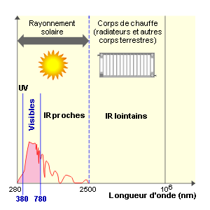 Le rayonnement solaire émet dans les courtes longueurs d'onde, d'où l'astuce : il est possible de laisser entrer les apports solaires (chaleur et lumière) tout en empêchant les infrarouges de grande longueur d'onde (chaleur des objets et murs de la pièce) de quitter la maison ! C'est le but des vitrages dits basse émissivité ou Low E en hiver.