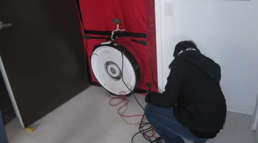 Ce test consiste à fermer toutes les fenêtres et portes, en plus de boucher les autres ouvertures (la cheminée, par exemple). On installe ensuite un gros ventilateur dans la porte d’entrée principale, qu’on scelle pour ne pas créer d’autres trous; en le mettant en marche, on crée une différence de pression artificielle entre la maison et l’extérieur.