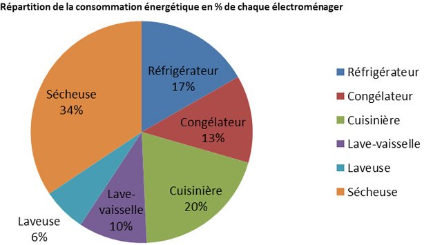 La sécheuse représente 34% de la consommation de tous les électroménagers ; elle atteint environ 945 kWh/an et elle n’est pas ENERGY STAR. De quoi y renoncer quand c’est possible, et opter pour la corde à linge ou l’armoire sèche-linge ... Ensuite viennent la cuisinière, le réfrigérateur, le congélateur, le lave-vaisselle et la laveuse. Si ces pourcentages peuvent s’avérer minimes sur une consommation globale, reste qu’en choisissant les alternatives les plus éco-énergétiques, la facture d’électricité peut diminuer.