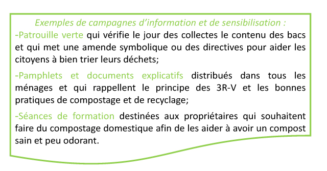 Étant donné que le recyclage est encore parfois mal pratiqué et que le compostage est une pratique relativement nouvelle au Québec, il est particulièrement adéquat d’instaurer des mesures de sensibilisation et des campagnes de communication efficaces pour faire connaître les biens-faits de ces collectes, démystifier certaines croyances et valoriser les pratiques.