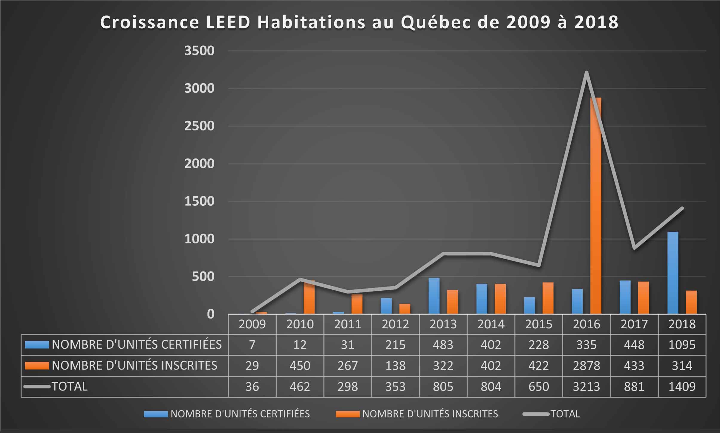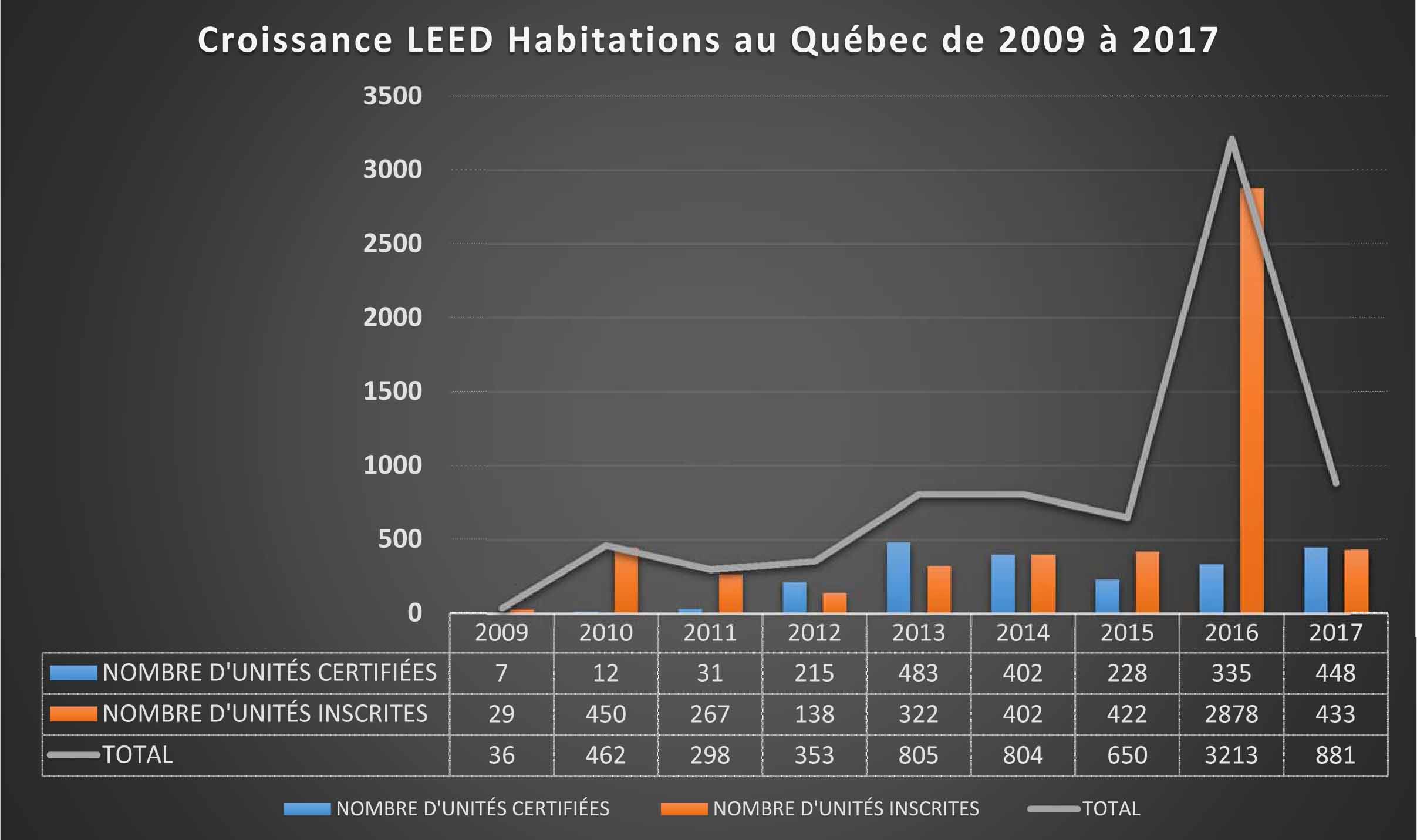 Depuis 2009, la croissance LEED® habitations au Québec ne s'est jamais démentie malgré les variations entre 2013 et 2015 (voir l'histogramme ci-dessous). En avril 2018, l'Ontario détenait 53% des certifications résidentielles et le Québec 37%. 90% de toutes les certifications au Canada l'ont donc été jusqu'à maintenant dans ces 2 provinces.