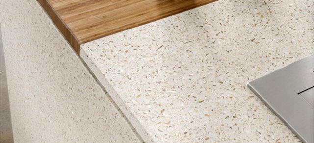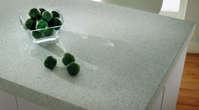 Par contre, ces comptoirs doivent être faits sur mesure, ce qui peut augmenter les coûts, et les morceaux de verres peuvent s'effriter. Pour l'usage, on conseille d’utiliser une planche à découper, mais ils sont hygiéniques et faciles à entretenir. Une surface légèrement rugueuse masquera les rayures. En plus de contenir un haut pourcentage de verre recyclé, ce type de comptoir est sain. Manufacturé aux États-Unis, il est tout de même distribué au Canada. Ce matériau contient une composante, un liant epoxy, ce qui peut laisser des tâches de chaudrons chauds et peut jaunir à long terme.