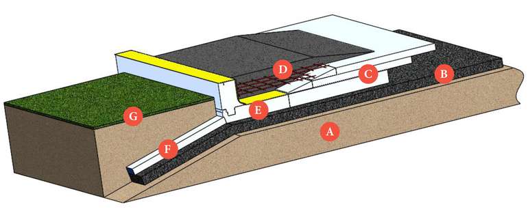 Comme il s’agit d’un système de dalle sur sol, il n’y a pas d’excavation nécessaire; seul le sol végétal doit être retiré. L’installation se fait donc avec moins de répercussions sur l’environnement, la végétation, la nappe phréatique et le milieu naturel environnant. Après l'installation de gravier (pour un bon drainage), la dalle est prête à être installée.