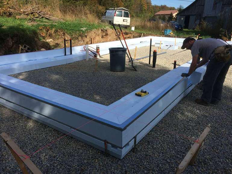Encore considérée comme avant-gardiste il y a une dizaine d'années, la dalle sur sol protégée du gel, économe en béton, est une assise de bâtiment avantageuse maintenant bien reconnue pour les petites habitations. Approuvée par un ingénieur, et donc conforme au code de construction du Québec et du Canada, la dalle structurale isolée à haut rendement énergétique est adaptée au climat froid et à pratiquement tous les types de terrains à faible pente, y compris les sols argileux. Aujourd'hui, il existe des modèles conçus spécifiquement pour les bâtiments passifs et maisons passives..