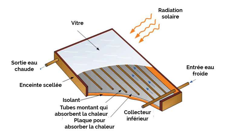 Les conceptions varient légèrement selon les marques, mais en somme, il s’agit d’une boite peu profonde dans laquelle courent des serpentins de cuivre, recouverte d'une plaque métallique absorbante et d'une autre transparente. Le liquide, frais, est pompé à travers les tubes et chauffé dans la boucle. Un mélange de glycol circule dans la plaque inférieure et les tubes de cuivre ; ces deux composantes nécessitent donc des réservoirs de stockage spécifiques dotés de serpentins pour le transfert de la chaleur.