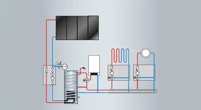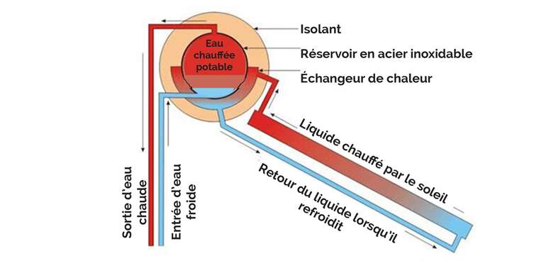 Du fait du glycol utilisé dans le système, un échangeur de chaleur est requis pour transférer les calories qui serviront à chauffer la maison, l’eau ou les deux. Le liquide chauffé provenant des panneaux solaires transmet ses calories à l'eau lorsqu'elle traverse un serpentin dans le réservoir de stockage. Un serpentin supplémentaire alimenté au gaz ou à l'électricité dans le réservoir chauffera l'eau si le panneau solaire ne peut pas maintenir la température désirée ou soutenir la demande.