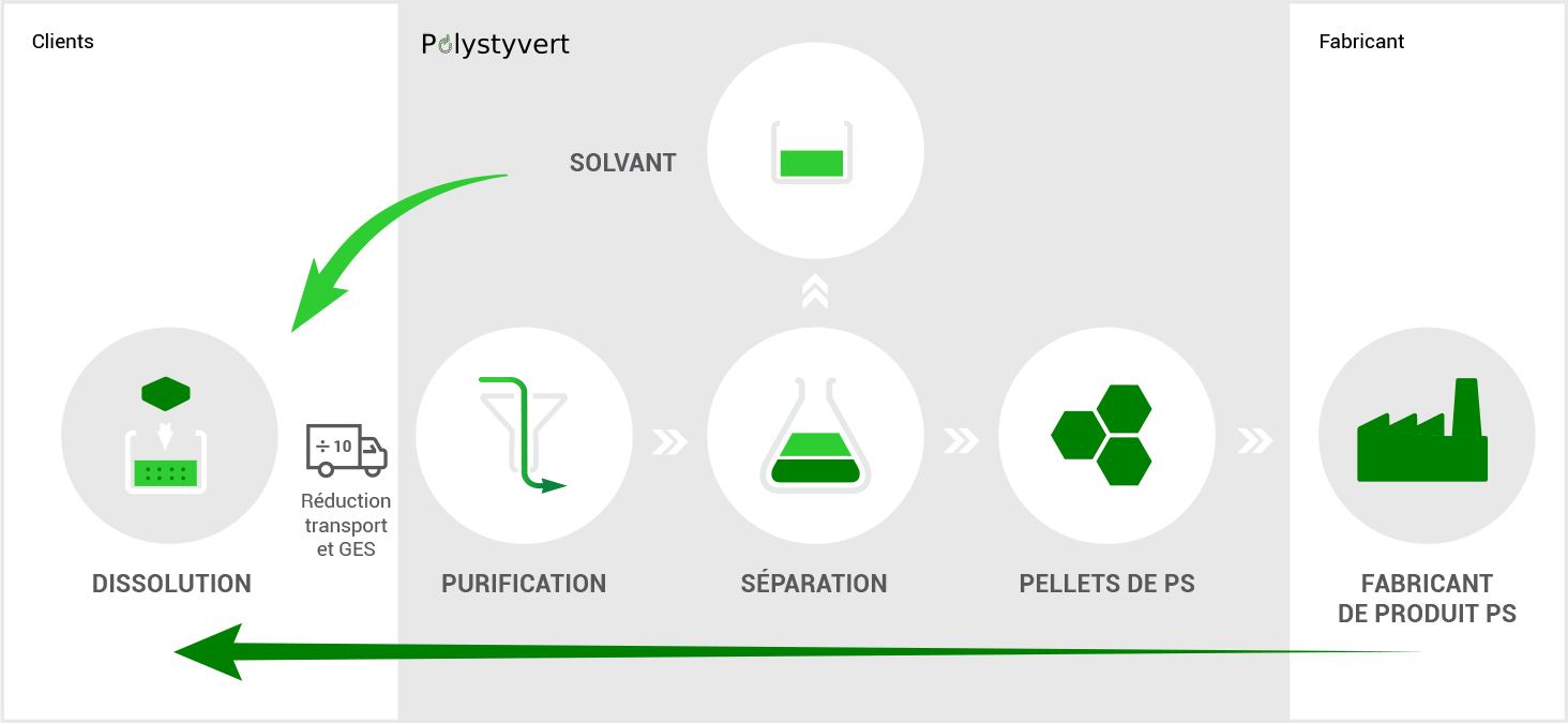 Claire Holzer précise que : « pour le fonctionnement du procédé Polystyvert, nous installation sur site, là où le déchet de polystyrène est généré, notre module de dissolution. Cet équipement peut être installé à toutes les places ayant des déchets de polystyrène, par exemple des magasins d'électro-ménager, de meubles, des épiceries, etc.. Le module est loué avec un frais mensuel et un frais de cueillette ».
