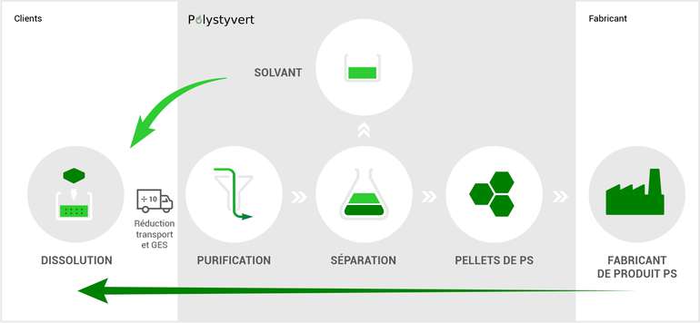 Le polystyrène peut se recycler ainsi plus de 40 fois avant que sa qualité ne soit altérée. De plus, la technologie permet d’enlever les contaminants sur les plastiques, et de retirer le HBCD contenu dans les polystyrènes. La nouvelle usine, située à Anjou, peut présentement recycler jusqu'à 600 tonnes de ce plastique à chaque année.