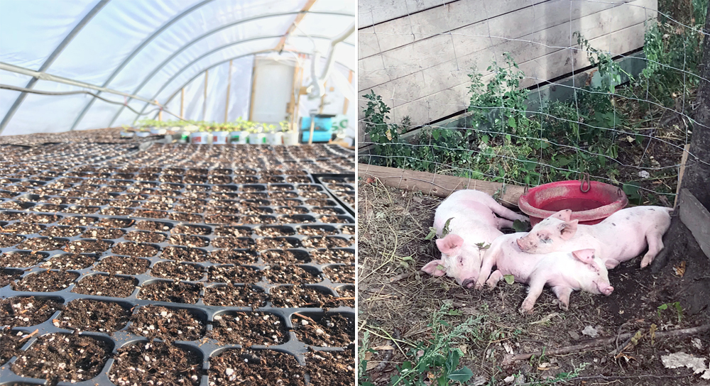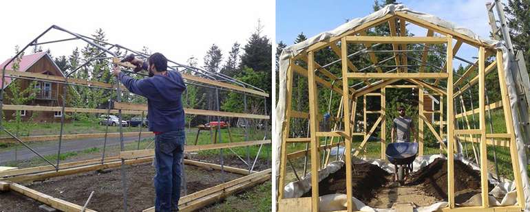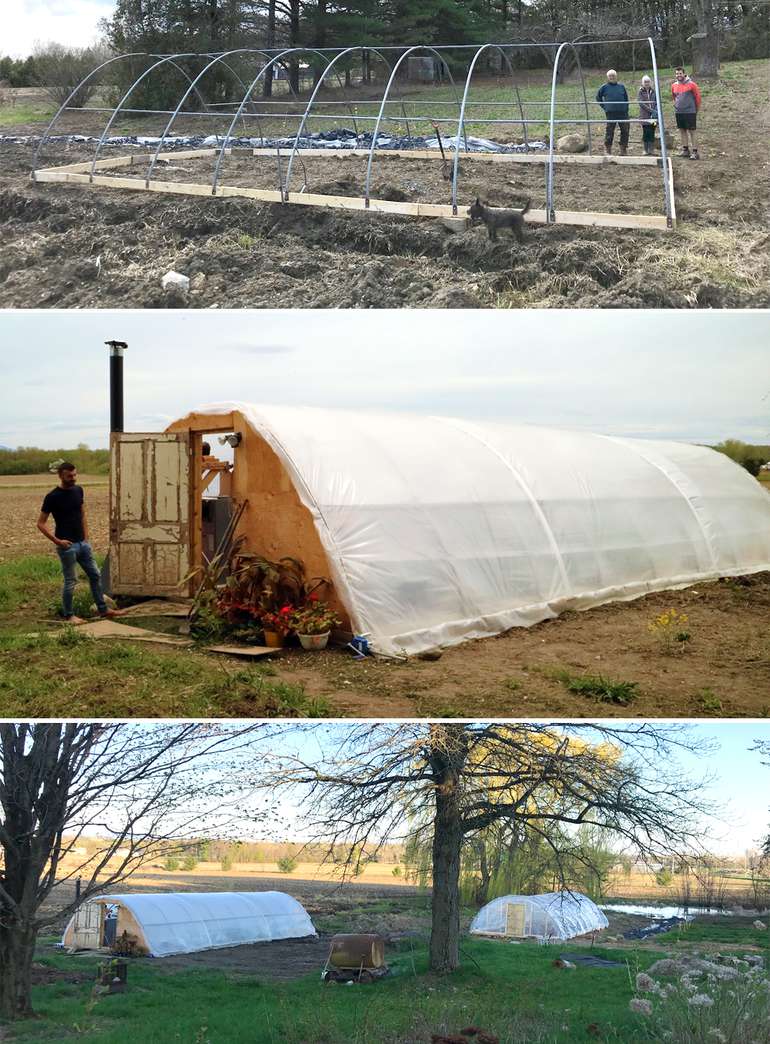Dans le but de développer leurs activités, le couple Teasdale et Bachand ont acheté une vieille structure de serre en métal d’un agriculteur retraité du coin. Étant très grande, celle-ci a été séparée pour faire deux serres indépendantes, renforcées de chaque côté avec du bois. Une toile de polythène double, séparée avec une couche d’air isolante, a été achetée chez un fournisseur du coin, Dubois Agrinovation à St-Rémi, spécialiste en matériel pour petits maraîchers.
