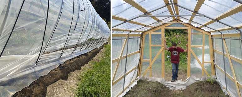 Les côtés s’ouvrent au besoin pour laisser entrer de l’air frais. Les serres sont fixées au sol avec des pieux. L’une des serres a été isolée afin de partir les semis au printemps au début avril.