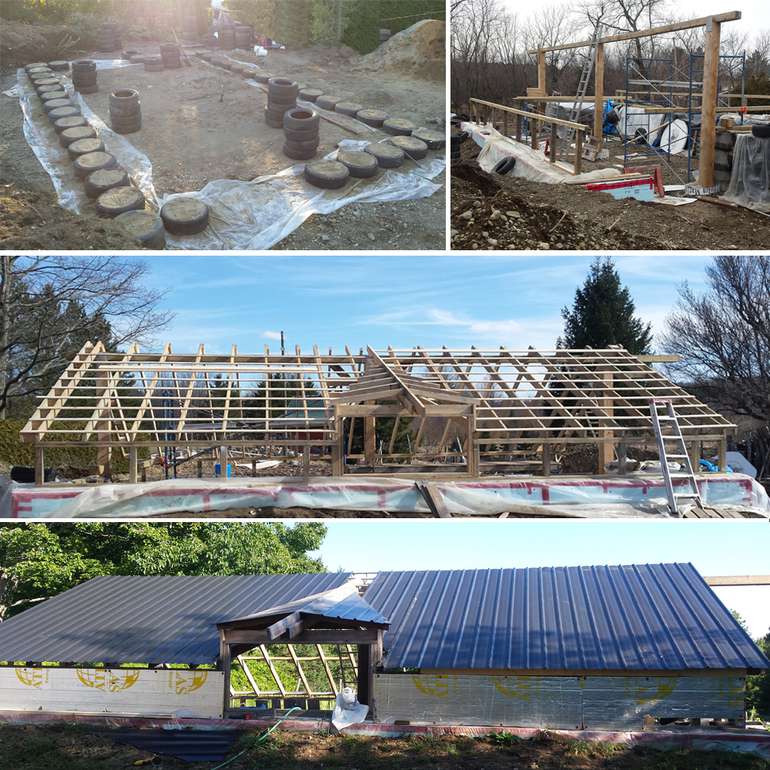 Fabrication. Pierre Fisette a bâti lui-même sa serre solaire passive. Autodidacte, il a participé à des formations et s’est informé sur Internet. Il s’est basé sur les plans d’une serre existante qu’il a adaptée à ses besoins. Le côté nord est un mur enfoui (environ 6 pi) constitué de pneus (310 au total!) remplis de sable de compaction. D’une hauteur totale intérieure de 16 pi, les 3 autres façades reçoivent du soleil.