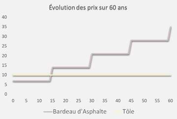 Voici un exemple qui illustre bien le principe: les bardeaux d’asphalte, assez abordables mais moins durables et hautement polluants, ont une durée de vie limitée à 15 ans*, environ. Eh oui, la garantie à vie annoncée sur les paquets est limitée, et elle se limite à 20 ans. Mais la plupart des toitures sont soumises à rude épreuve avec les éléments et vieillissent prématurément: un ensoleillement extrême sur la pente orientée au sud qui fait sécher et se recroqueviller le bardeau, par exemple... Il est vrai que depuis l'arrivée des bardeaux à fibres de verre, la durée de vie est plus intéressante, soit plus de 25 ans, mais la recyclabilité est nulle et même les rejets de production sont envoyés à l'élimination.