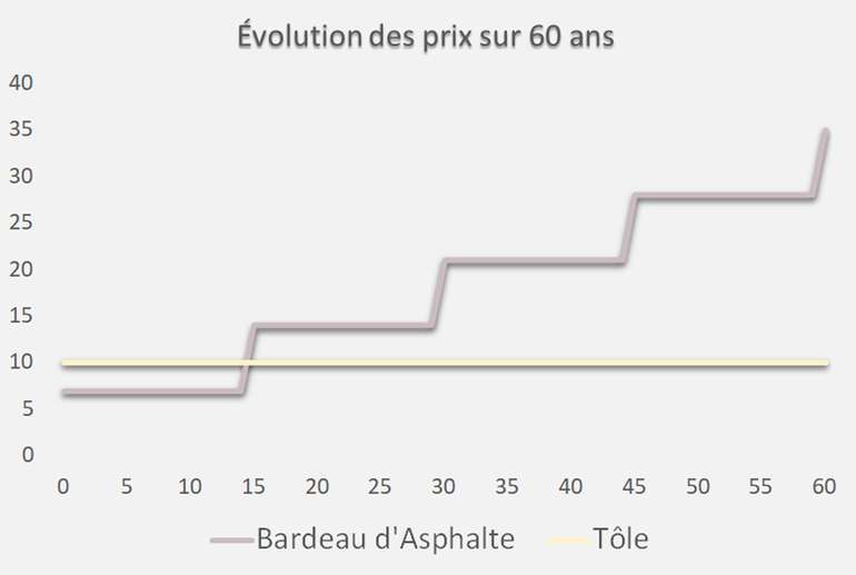 La toiture de tôle, elle, a une durée de vie qui dépasse largement les 50 ans. De plus, on peut la recyclé à 100 % en fin de vie. Sur 50 ans, on posera donc environ trois revêtements de toits de bardeaux pour un seul de tôle! À long terme, le coût initial de ce revêtement sera donc largement compensé.