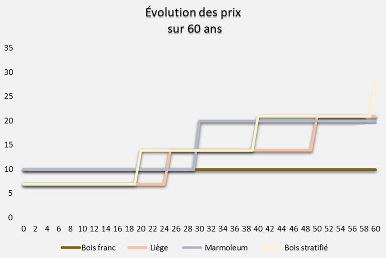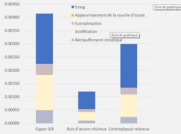 L'analyse de ces graphiques permet de trancher: parmi les revêtements évalués, mieux vaut opter pour la tôle au niveau des toitures et pour le bois franc au niveau des murs et sols (le liège est également une bonne option au sol).