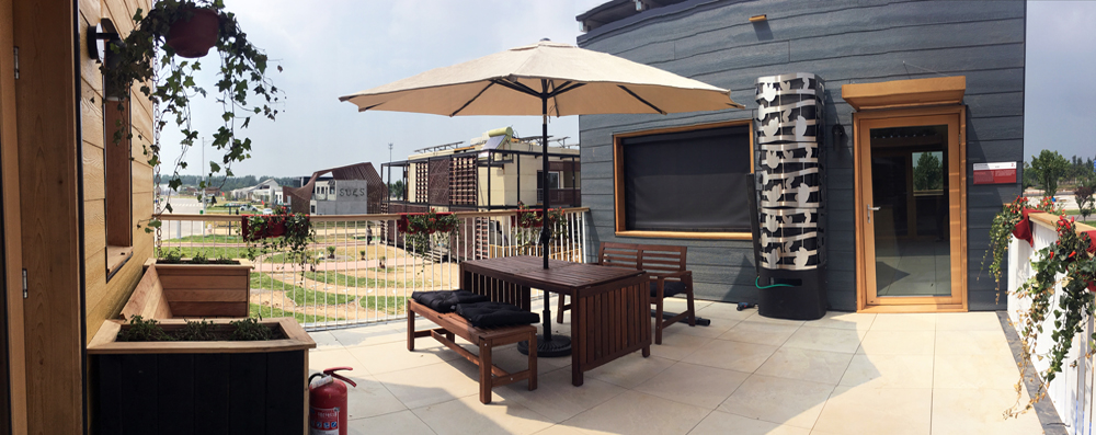 Le logement performant, prévu pour un environnement urbain, est neutre en émissions de carbone. Le bois est de provenance locale, certifié FSC et 100% recyclable en fin de vie. Des panneaux solaires ont été intégrés dans la toiture, et la consommation moyenne du bâtiment est de moins de 80 % de celle d’une habitation conventionnelle de même taille, soit une consommation finale de 15 kW par m2 par année, pour un changement d’air de 0.3 CAH. À titre indicatif, la certification Passiv House demande 0.6 CAH et un bâtiment au code 1.5 CAH.