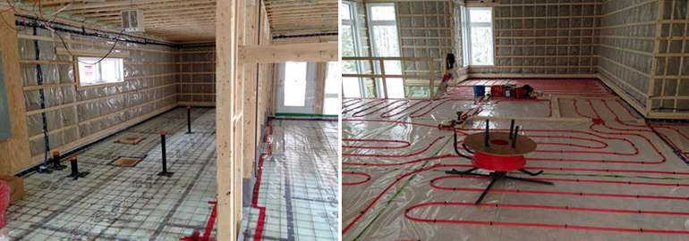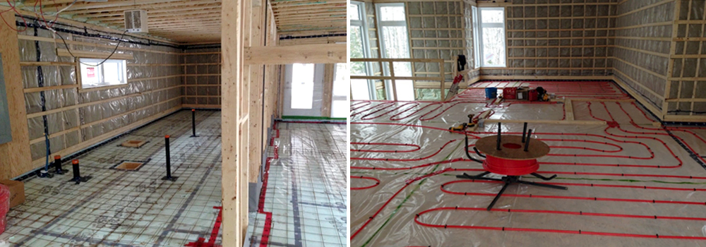 - un chauffage radiant hydronique incorporé dans une dalle de béton à l’étage et au rez-de-chaussée, permettant de tirer profit de la masse thermique du béton;