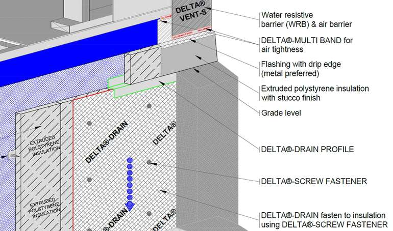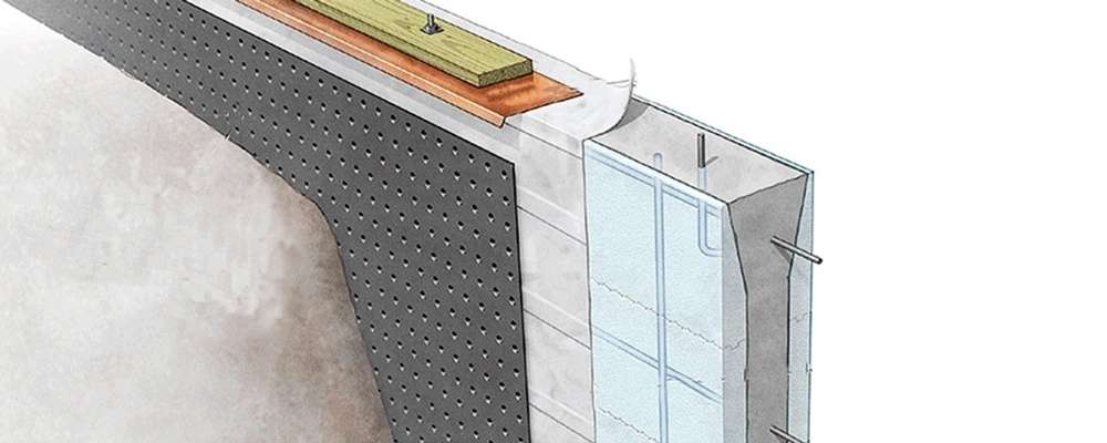 Vous devrez utiliser des attaches extra longues (voir par exemple la Delta-Grip Fastener de Dorken), conçues pour maintenir la membrane contre l’isolant. Et puisque l’isolant doit s’étendre jusqu’au sommet de la fondation de béton, il faudra absolument poser un solin métallique en forme de Z sur le rebord du matelas drainant (membrane alvéolée) afin que l’eau ne s’insère pas à l’arrière.
