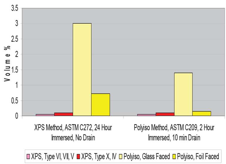 Owens Corning a de son côté comparé divers isolants de mousse rigide selon les critères ASTM C272. La figure suivante montre des différences significatives dans les niveaux d'absorption d'eau**.