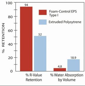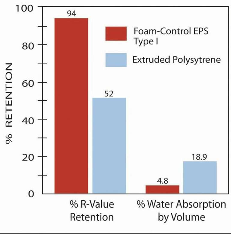 À cet effet, le lab indépendant Stork Twin City Testing a évalué des panneaux de XPS et EPS enterrés pendant 15 ans sur des murs de fondation situés dans le Minnesota. L'EPS était 4 fois plus sec que le XPS : le EPS contenait 4.8 % d’humidité par volume alors que le XPS en contenait 18.9 %. Après avoir fait sécher les isolants pendant 30 jours, il ne restait que 0.7 % d’humidité dans le EPS alors qu’il en restait toujours 15.7 % dans le XPS.