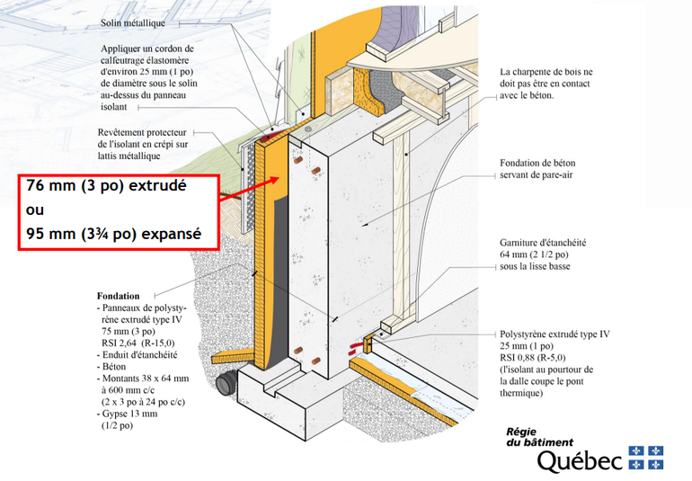 Le Règlement sur l’efficacité énergétique - partie 11 du Code de construction exige une isolation des murs de fondations à RSI 2,99 (R 17) sur la pleine hauteur ; la Régie du bâtiment du Québec propose plusieurs méthodes pour arriver à cette performance, dont l'isolation avec des panneaux de polystyrène par l'extérieur, appliqué comme suit: