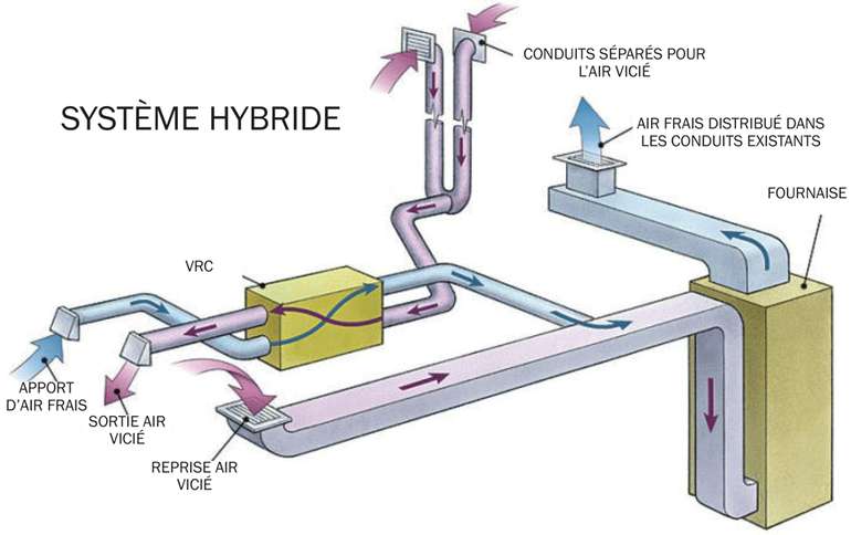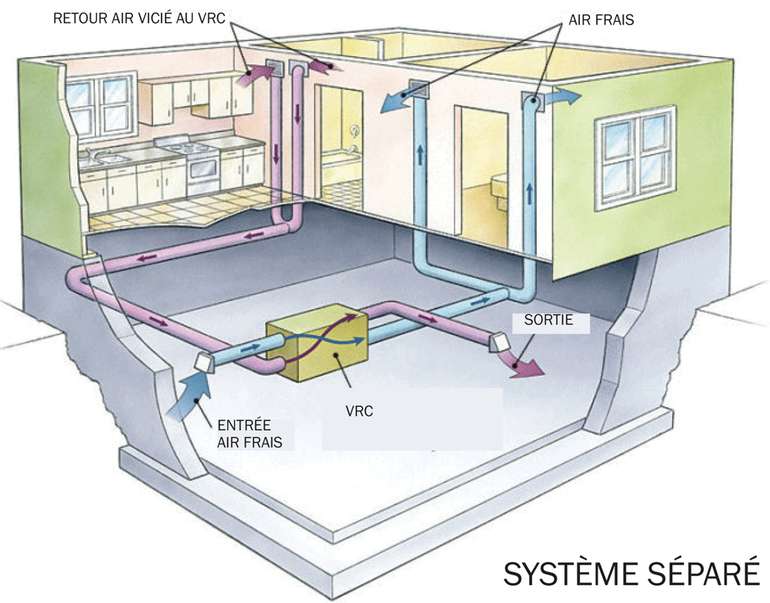 Un circuit de conduits dédié pour chaque système: voilà l'installation à prioriser. Ainsi, si votre système de chauffage distribue la chaleur à l'air pulsé, nous vous conseillons d’ajouter un réseau de conduits spécifique pour le ventilateur récupérateur de chaleur (VRC). C’est évidemment plus simple à planifier lors d'une construction neuve: de toute façon le VRC est désormais obligatoire, autant concevoir deux réseaux distincts. Dans le cas d'une rénovation, il vous faudra tout de même réfléchir à la question: utiliser les conduits déjà en place est faisable (et chose courante), mais c'est loin d'être l'idéal.