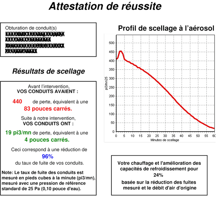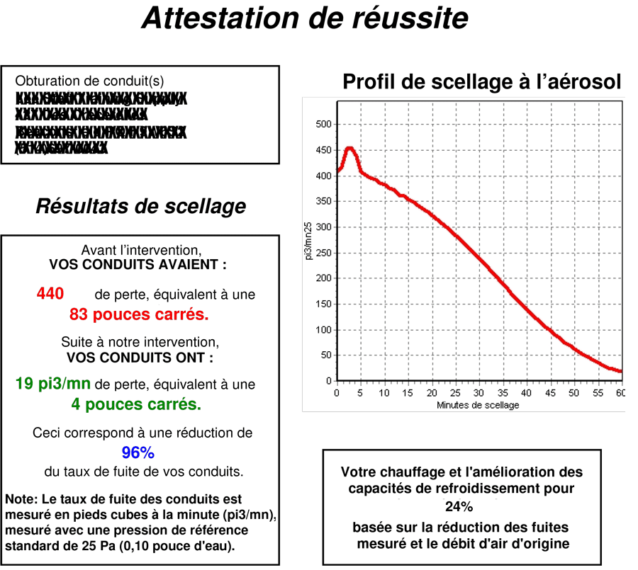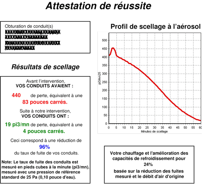 Patrick Rouleau : « Le réseau de conduits est d’abord pressurisé afin d’être testé et analysé. Lorsque les fuites sont trop importantes, un robot peut être envoyé afin de colmater les trous de grand diamètre, puis le procédé peut débuter. Le produit sous forme liquide est chauffé de manière à le transformer en aérosol. Projetées dans les conduits, les particules tenteront de s’échapper par les fuites, et s’accumuleront alors autour des fissures, pour finir par les obturer complètement. Ainsi colmatées, les particules peuvent résister à des pressions pouvant atteindre 2000 Pa ».