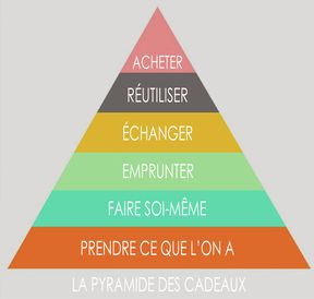 En somme, un peu à l’image de la pyramide énergétique de l'habitation, on pense à la pyramide des cadeaux avant d'offrir : acheter est la dernière option à envisager si l'on veut réellement un temps des Fêtes écolo!
