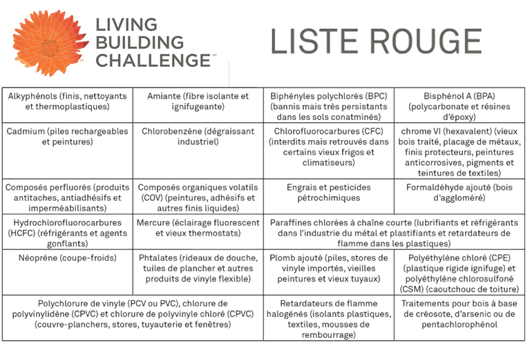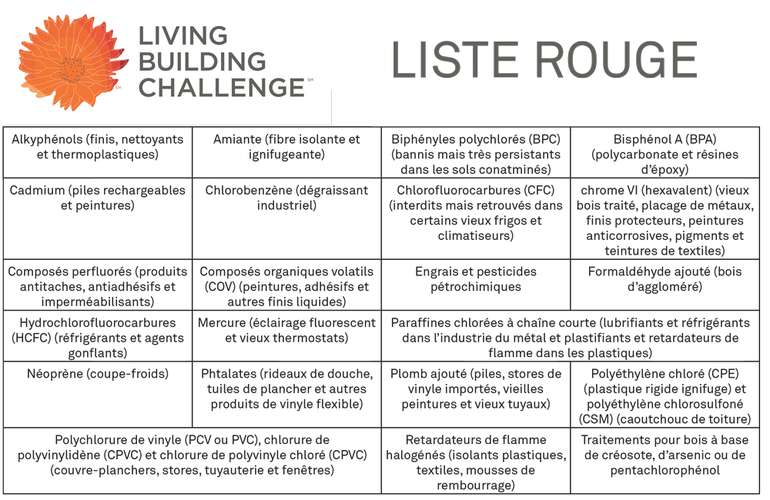 Les défis du LBC, ma conjointe Carolyn et moi les côtoyions bien avant de retirer le premier clou de notre maison ancestrale. Dans le pétale « matériaux », la Liste rouge est l’impératif le plus difficile à respecter. En fait, cela équivaut à demander aux fabricants de matériaux de faire un virage de 180 degrés en divulguant leurs recettes de fabrication, soit leurs secrets industriels, puisque la certification exige de prouver que leurs produits sont exempts des 23 produits chimiques interdits par le LBC.