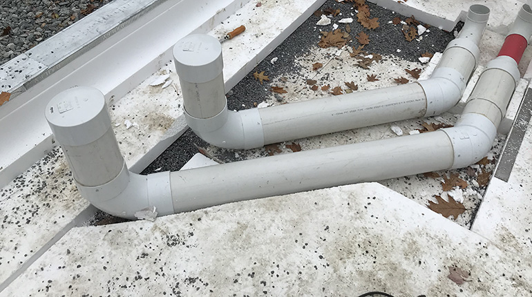 On vous a parlé de ce fameux chauffe-air solaire ici, avec ses avantages et particularités. En somme, le système imaginé par Legalett consiste en un réseau en boucles fermées : des tubes de 4 pouces traversant le béton, avec une boîte de chauffage encastrée directement dans le sol. Dans le cas de la future maison de démonstration, des tubes de 6 pouces (voir ci-dessous), qui alimenteront en air comprimé les panneaux solaires du mur sud de la maison, seront ajoutés à ce système. L'air chauffé par ces panneaux solaires sera injecté dans le système de chauffage par le sol, ce qui réduira la demande pour le serpentin de chauffage.