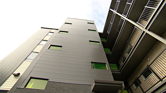 En effet, étant donné le peu d’espaces dont disposaient les architectes pour installer le bâtiment, il était difficile de conserver assez d’espace extérieur pour aménager ce lieu. Aussi, les architectes ont retiré le traditionnel corridor intérieur entre les logements pour limiter l’implantation du bâtiment et ont plutôt eu recours à des escaliers extérieurs et des balcons en coursive.