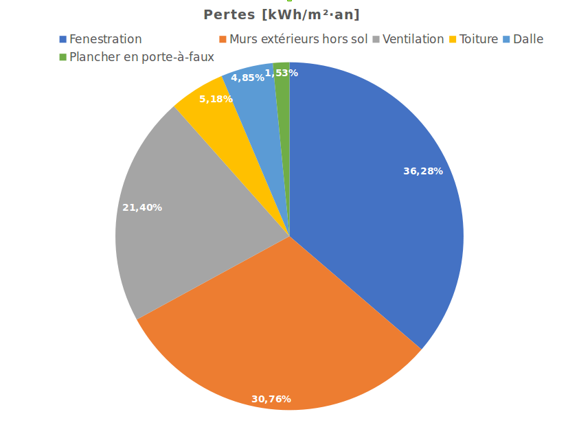 Cet exemple témoigne encore une fois de l'importance des portes et fenêtres avec plus de 36% des pertes occasionnées par celles-ci! Écohabitation recommande de toujours soumissionner auprès de plusieurs fournisseurs pour les produits de fenestration. En effet, certains choix sont plus onéreux que d'autres et en considérant plusieurs options on réussi à trouver un équilibre entre l'investissement initial et la performance sur le long terme. Éventuellement la question de les rénover ou de les changer se pose. Cependant cela demande un autre investissement important, des fonds qui sont rarement disponibles dans le secteur du logement communautaire.