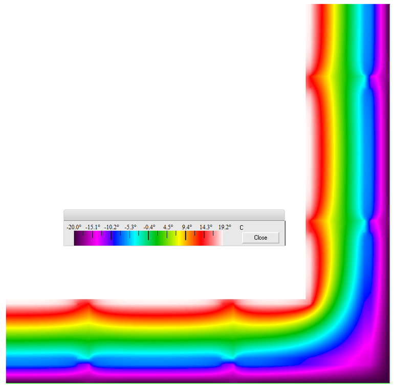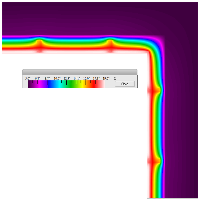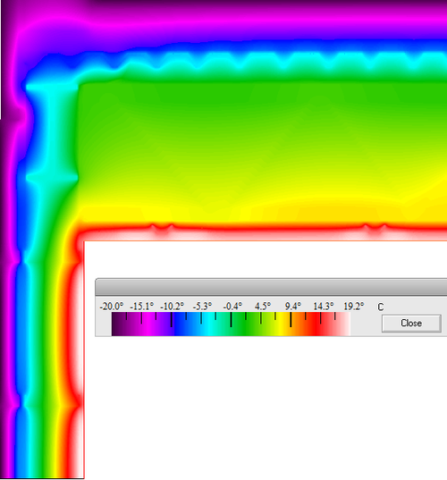 On constate que la température de surface du mur du côté intérieur (+19,6 °C) est en tout point très près de la température de consigne (+20 °C) même par une température extérieure de –20 °C, ce qui est un gage de confort intérieur et d’économie d’énergie. On peut donc considérer cette jonction comme n’ayant pas de pont thermique.